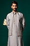 Featuring a grey bundi jacket in silk base with sequins, cutdana and zardosi handwork. It is paired with a kurta and pants. Style it with mojaris for a wedding, sangeet or engagement ceremony.