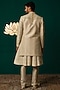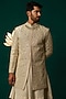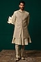 Featuring an ivory sherwani in silk base with sequins and zardosi handwork. It is paired with an angrakha and pants. Style it with mojaris and malas for a wedding, sangeet or engagement ceremony.