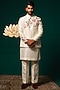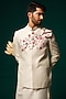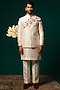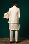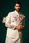 Featuring a white nehru jacket in silk base with handpaint and handwork. It is paired with a kurta and pants. Perfect for a wedding or sangeet ceremony, exuding charm and elegance.