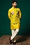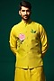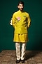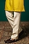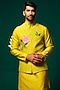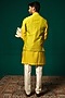 Featuring a yellow nehru jacket in silk base with hand paint and handwork. It is paired with a kurta and pants. Perfect for a wedding or haldi ceremony, exuding charm and elegance.