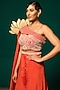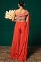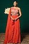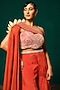 Featuring an orange top in chinon base with embroidery. It is paired with sharara pants and one sided cape. Accentuate it with statement jewellery and heels for a sangeet ceremony.