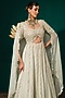 Featuring a pastel mint anarkali in chinon and pure tissue base with floral motif embroidery. It is paired with a dupatta. Style it with block heels, polki earrings and a sleek bun for a regal look. Ideal for a mehendi ceremony or weddings.