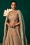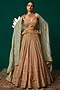 Featuring a pastel peach lehenga in shimmer tissue base with beads, thread, sequins, cutdana and moti hand embroidery. It is paired with an embroidered blouse and a sage green embroidered dupatta. Accentuate it with with kundan polki or pearl jewellery, embellished heels and a potli bag for a bridal look, Perfect wear for your wedding, sangeet or engagement ceremony.