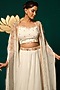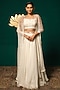 Featuring a white cape in chinon base with handwork. It is paired with an embellished blouse and a lehenga. Accentuate it with polki jewellery, wavy curls and block heels for festive, engagement, sangeet or cocktail ceremonies.