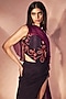 Featuring a deep plum sculpted corset in crepe and georgette base with abstract flame cording and molten embroidery. It is paired with a high-slit skirt and a cape. Accentuate it with dangler earrings and heels for expressive evenings and statement occasions.