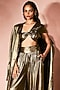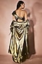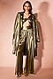 Featuring a gold one shoulder bralette in metal foil base. It is paired with wide-leg gathered pants and a fluid trench coat. Accentuate it with dangler earrings and heels for expressive evenings and statement occasions.