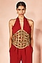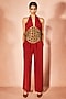 Featuring an orange halter-neck jumpsuit in micro and shimmer base. It is paired with a molten gold corset belt having 3D cording. Accentuate it with dangler earrings and heels for cocktail nights or statement occasions.