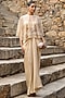 Featuring a beige cape in dupion silk and organza base with pearls, zardosi and resham embroidery. It is paired with a bustier and a draped skirt. Style it with kundan polki earrings and block heels for sangeet functions or festive gatherings.