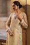 Featuring a beige kurta in organza and silk tencel base with pearls and resham embroidery. It is paired with straight pants, an inner and an embroidered dupatta. Style it with kundan polki earrings and block heels for sangeet functions or festive gatherings.