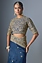 Featuring a blue saree in organza and chiniya silk base with thread, zardosi, aari dori and tikki embroidery. It is paired with a blouse having bottis spread all over. Accentuate it with dangler earrings and heels for a festive occasion, cultural event, wedding or engagement ceremony.