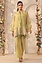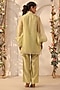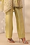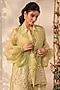 Featuring a green top in organza and silk tencel base with balloon sleeves, tie-up detail, applique, resham and pearl embroidery. It is paired with an inner and straight pants. Accentuate it with diamond earrings and wedges, perfect for festive brunches, pooja ceremony or family gathering.
