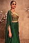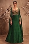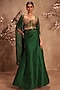 Niti Bothra presents a green cape in raw silk and organza base with mirror, zardosi and tikki embroidery. It is paired with a bustier and a lehenga. Accentuate with statement jewellery and heels for a sangeet, wedding or engagement ceremony.