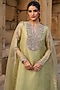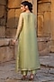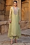 Featuring a green kurta in organza and silk tencel base with zardosi, pearls and resham embroidery. It is paired with straight pants, an inner and an embroidered dupatta. Style it with kundan polki earrings and block heels for mehendi functions or festive gatherings.