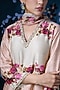 Featuring an ivory kurta in a Chanderi silk base with rose print, pearl, and tikki embroidery. It is paired with matching striped palazzo pants and a printed chiffon dupatta.