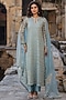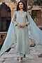 Featuring a light blue kurta in organza and silk tencel base with pearls, aari and dori embroidery. It is paired with straight pants, an inner and an embroidered dupatta. Style it with kundan polki earrings and block heels for sangeet functions or festive gatherings.