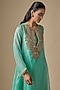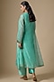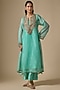 Featuring a light blue long pheran kurta in organza base with zardosi, tikki, and resham embroidery. It is paired with straight pants and an inner. Style the kurta set with kundan polki dangler earrings, choker necklace, and wedges or juttis for festive or wedding ceremonies.