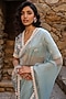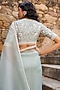 Featuring a light blue saree in organza base with zardosi, resham and pearls embroidery. It is paired with an embroidered blouse. Accentuate the designer saree with swarovski or zircon jewellery, soft curls and embellished heels for a wedding or sangeet ceremony.