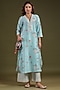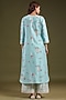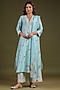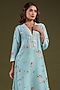 Featuring a light blue kurta in silk chanderi base with print, mirror and thread embroidery. It is paired with printed and embroidered pants. Accentuate it with dangler earrings and heels for a festive occasion or pooja ceremony.