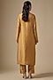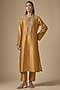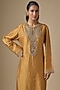 Featuring a mustard printed kurta in silk tencel base with zardosi embroidery. It is paired with embroidered pants. Style the kurta set with kundan polki dangler earrings and wedges or juttis for festive or wedding ceremonies.