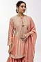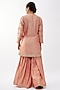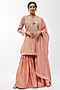 Featuring a peach kurta in silk base with tikka and zari dori embroidery. It is paired with sharara pants and a soft silk dupatta. Accentuate it with statement jewellery and heels for a festive occasion or engagement ceremony.