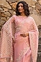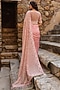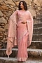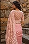Featuring a pink saree in organza base with aari, dori, tikki and pearls embroidery. It is paired with an embroidered blouse. Accentuate the designer saree with swarovski or zircon jewellery, soft curls and embellished heels for a wedding or sangeet ceremony.