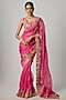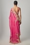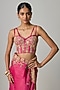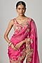 Featuring a pink saree in organza base with applique, tikki, beads and zardosi embroidery. It is paired with an embroidered corset blouse. Accentuate it with dangler earrings and heels for a festive occasion, cultural event, wedding or engagement ceremony.