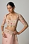 Featuring a pink saree in organza base with tikki, beads, applique and zardosi embroidery. It is paired with an embroidered blouse. Accentuate it with dangler earrings and heels for a festive occasion, cultural event, wedding or engagement ceremony.