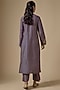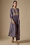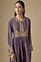 Featuring a purple frock-style kurta in silk tencel base with zardosi embroidery and print. It is paired with straight printed pants. Style the kurta set with kundan polki dangler earrings and wedges or juttis for festive or wedding ceremonies.