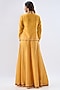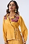Featuring a yellow top in silk tencel base with tie-up closure, print, beads, sequins and thread embroidery. It is paired with printed sharara pants. Style it with statement earrings and block heels for a festive occasion, sangeet or haldi ceremony.