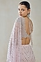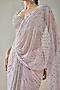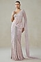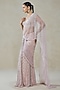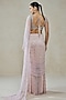 Nitika Gujral features a baby pink pre-draped saree in net and satin base with beads and sequins embellishments. It is paired a blouse. Accentuate it with meenakari earrings, a potli bag and block heels for a sangeet, cocktail or engagement ceremony.