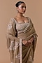 Nitika Gujral presents a stunning beige saree in lurex chiffon, organza, shantoon and satin base with resham, beads, pearls and crystal embroidery. It is paired with an embroidered blouse and an underskirt. Style this exquisite ensemble with luminous diamond jewellery, heels and refined makeup for a timeless look perfect for the most elite sangeet soirees.