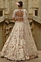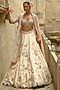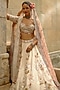 Nitika Gujral presents a cream lehenga in raw silk and organza base with gota, sequins, french knot, cutdana, pearls and zari work. It is paired with a blouse and a dupatta. Elevate the bridal lehenga with regal emerald jewellery, stilettos, finished with a richly embellished potli bag. Perfect for the wedding pheras, grand entrance, or a heritage palace ceremony.