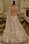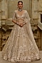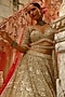 Nitika Gujral presents a gold lehenga in net base with crystal, cutdana and sequins embellishment. It is paired with a blouse and a dupatta. Elevate the lehenga with regal emerald jewellery, stilettos, finished with a richly embellished potli bag. Perfect for the wedding pheras, grand entrance, or a heritage palace ceremony.