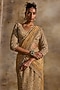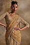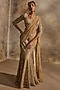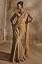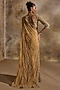 Nitika Gujral presents an exquisite Gold Pre-Draped Saree crafted in a net base, adorned with dabka, beads, sequins and crystal embroidery. It is paired with a finely embroidered blouse. Elevate this designer ensemble with zircon or swarovski jewellery, a floral hairdo, and embellished block heels for a striking look, perfect for weddings or engagements ceremonies.