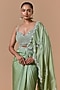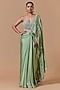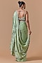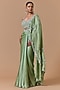 Nitika Gujral presents a stunning jade green pre-draped saree in satin and shantoon base with net floral applique palla detail. It is paired with a blouse having sequins, crystal and bead embroidery. Style this exquisite ensemble with luminous diamond jewellery, heels and refined makeup for a timeless look perfect for the most elite mehendi soirees.
