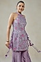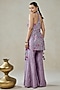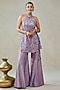 Nitika Gujral features a mauve halter-neck top in raw silk, shantoon and silk base with 3D floral, sequins and thread embroidery. It is paired with sharara pants. Accentuate it with meenakari earrings, a potli bag and block heels for festive occasions, haldi or sangeet ceremonies.