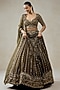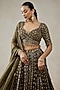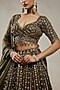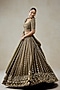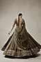 Nitika Gujral features a mehendi green lehenga in organza, shantoon and satin base with sequins, zari and beads hand embroidery. It is paired an embroidered blouse and a dupatta. Accentuate it with kundan polki jewellery, a potli bag and block heels for a wedding or engagement ceremony.