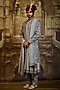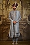 Featuring a blue-grey open sherwani in raw silk, cotton silk and chanderi silk base with resham embroidery. It is paired with a choga kurta and churidar. Style it with mala and mojaris for a wedding, sangeet or engagement.