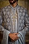 Blue-Grey Raw Silk & Cotton Silk Embroidered Sherwani Set