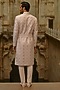 Featuring a light grey sherwani in raw silk base with dabka and sequins embroidery. It is paired with a cotton silk kurta and cotton lycra pants. Style it with mojaris for a wedding, sangeet or engagement ceremony.