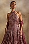 Nitika Gujral presents an exquisite Old Rose Halter-Neck Gown crafted in a tulle, net, and art satin base, adorned with metallic, sequins and crystal embellishments. It is paired with an embellished dupatta. Elevate this gown with zircon jewellery, a sleek bun, and embellished heels for cocktail evenings, receptions, or glamorous festive celebrations.