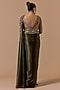 Nitika Gujral presents a stunning olive green pre-draped saree in shantoon and satin base. It is paired with a blouse having beads and crystal embroidery. Style this exquisite ensemble with luminous gold jewellery, heels and refined makeup for a timeless look perfect for the most elite mehendi soirees.