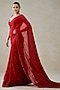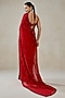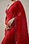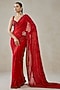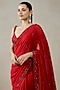 Nitika Gujral features a red saree in georgette, satin and shantoon base with beads and sequins embellishments. It is paired a blouse and an underskirt. Accentuate it with meenakari earrings, a potli bag and block heels for a sangeet, cocktail or engagement ceremony.