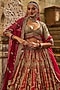Nitika Gujral presents a red-maroon lehenga in raw silk and organza base with dabka, zari, zardosi and kundan stone embellishments. It is paired with a blouse and a dupatta. Elevate the bridal lehenga with regal gold jewellery, stilettos, finished with a richly embellished potli bag. Perfect for the wedding pheras, grand entrance, or a heritage palace ceremony.