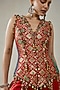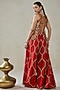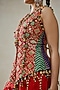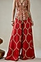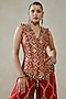 Nitika Gujral features a red sleeveless top in patola silk, shantoon, satin and chanderi base with geometric pattern, beads and tassels embellishments. It is paired with sharara pants. Accentuate it with meenakari earrings, a potli bag and block heels for festive occasions or sangeet ceremonies.