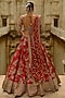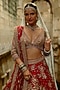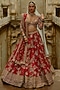Nitika Gujral presents a red lehenga in raw silk and net base with dabka, zari, zardosi, kundan and sequins work. It is paired with a blouse and a dupatta. Elevate the bridal lehenga with regal gold jewellery, stilettos, finished with a richly embellished potli bag. Perfect for the wedding pheras, grand entrance, or a heritage palace ceremony.