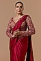 Nitika Gujral presents a stunning red pre-draped saree in shantoon and satin base. It is paired with a net blouse having crystal and bead embroidery. Style this exquisite ensemble with luminous diamond jewellery, heels and refined makeup for a timeless look perfect for the most elite sangeet soirees.