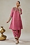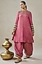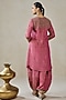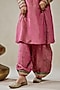 Nitika Gujral features a rose pink kurta in crushed tissue, banarasi silk and shantoon base with cuff panel and beads embroidery. It is paired salwar pants. Accentuate it with meenakari earrings, a potli bag and block heels for festive occasion, casual wear or cultural events.