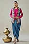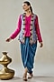 Nitika Gujral features a royal blue layered jacket in patola silk, shantoon and chanderi base with geometric pattern, beads, coin and tassels embellishments. It is paired with an inner top and a dhoti skirt. Accentuate it with meenakari earrings, a potli bag and block heels for festive occasions or sangeet ceremonies.