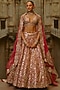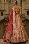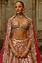 Nitika Gujral presents a rust lehenga in taffeta and organza base with mirror, zari, pearls and kasab embellishments. It is paired with a blouse and a dupatta. Elevate the bridal lehenga with minimal kundan jewellery, stilettos, finished with a richly embellished potli bag. Perfect for the wedding pheras, grand entrance, or a heritage palace ceremony.
